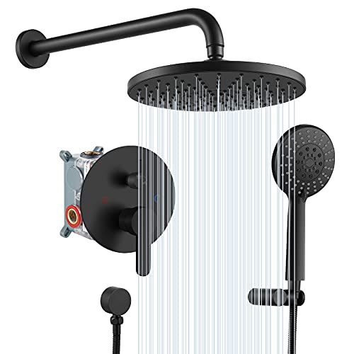 Buy 1 get 1 Aolemi 8 Inch Matte Black Shower System Round ABS Rainfall Shower Head with 5 Functions ABS Handheld Spray Wall Mount Shower Faucet Set Bathroom Rough-in Valve and Shower Trim Included